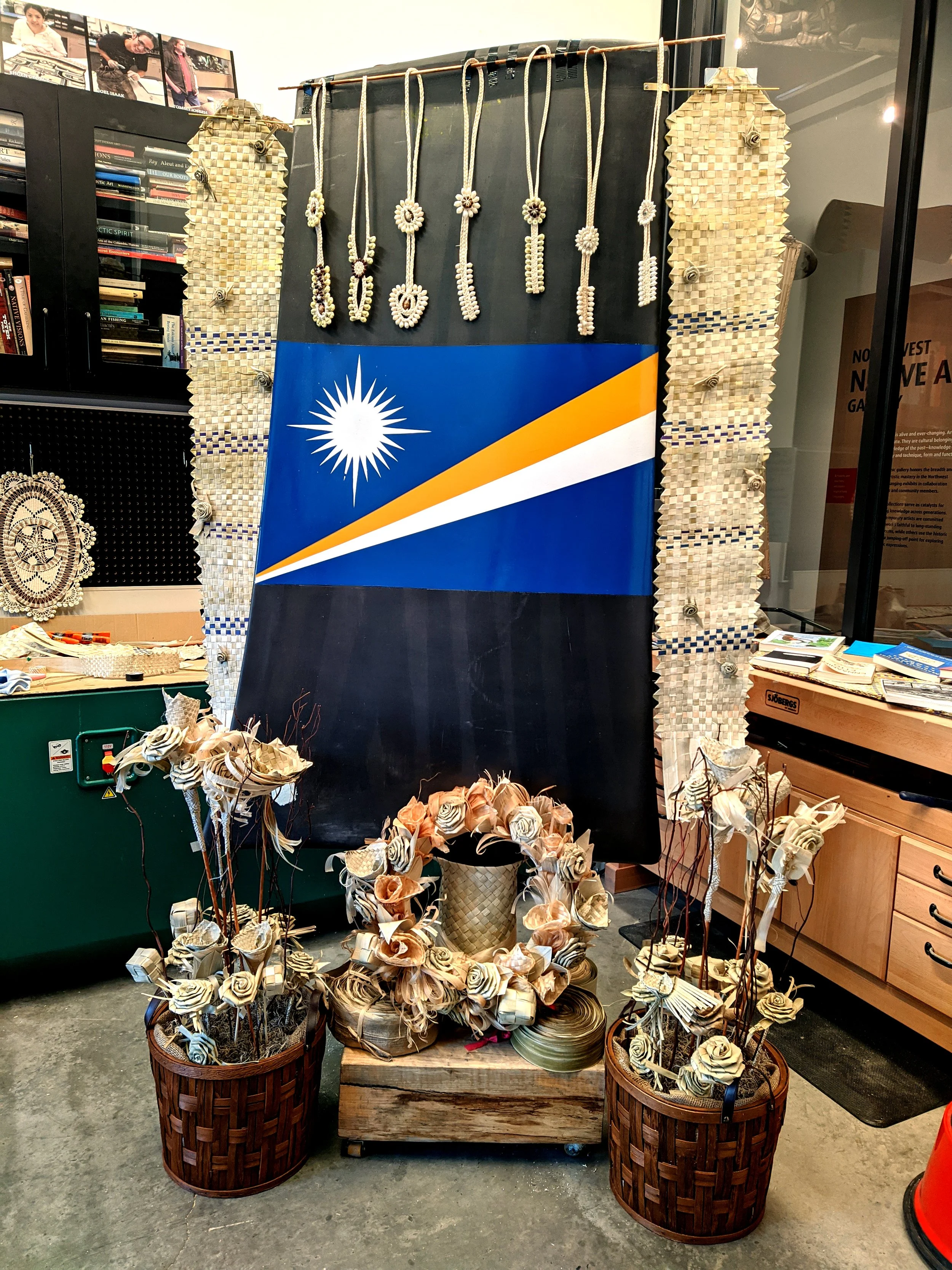Hanging from the top are our shells leis we use to thank people for working and visiting with us -- the leis show respect and that is how we build new relationships. All the flowers surrounding it also honor - what people endured from the nuclear events was so hard, but what we can do today is work on pushing for better things to happen.