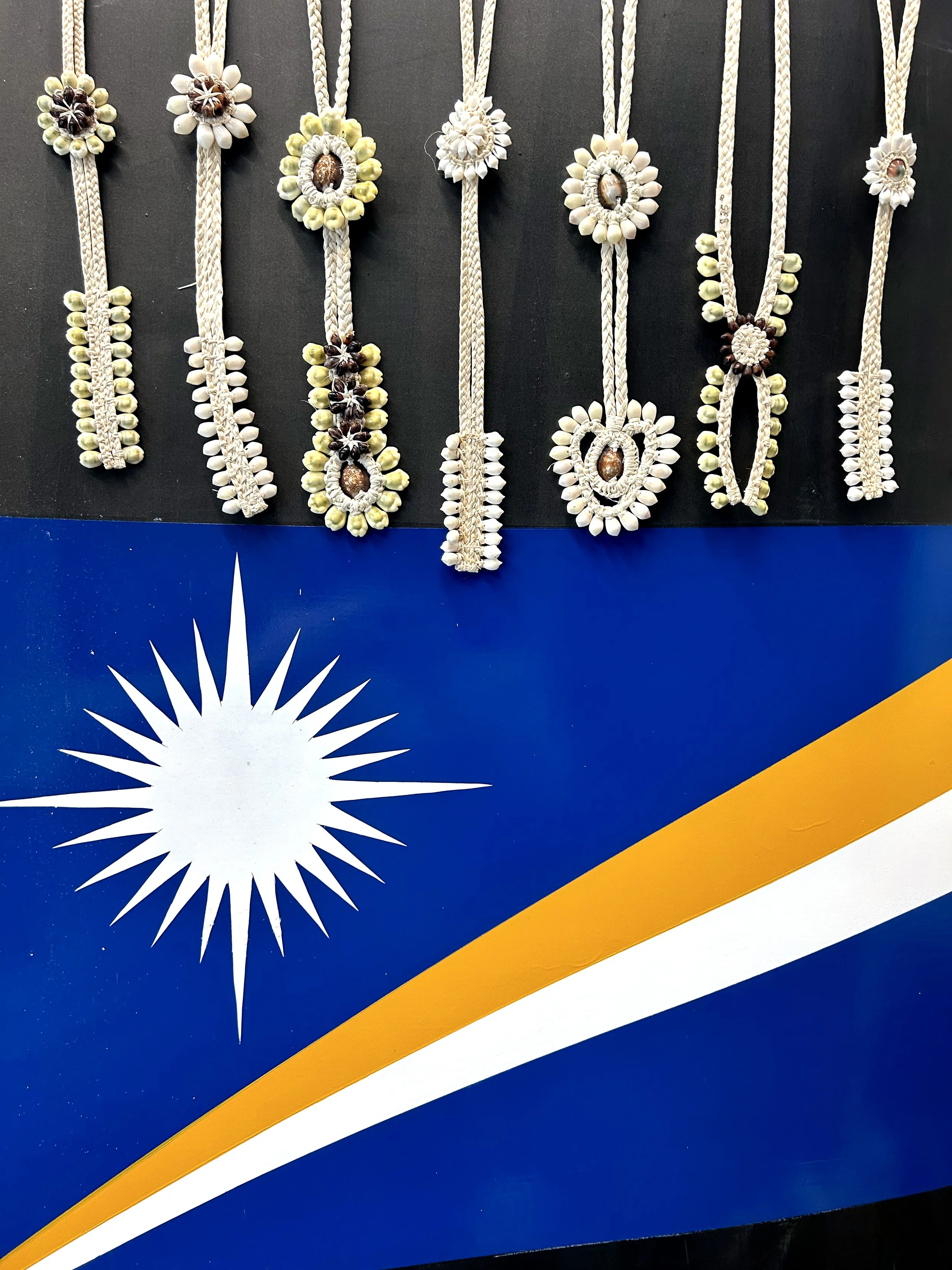 I used materials that come from the Marshall Islands. For the mats hanging on each side, I was thinking about the mats that we make to kajeraman, remembering and thanking the many community leaders who have been working so hard on the nuclear legacy to make things better. The mats honor those leaders.